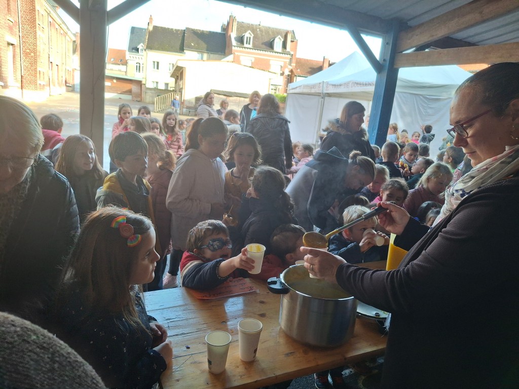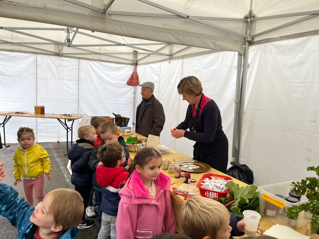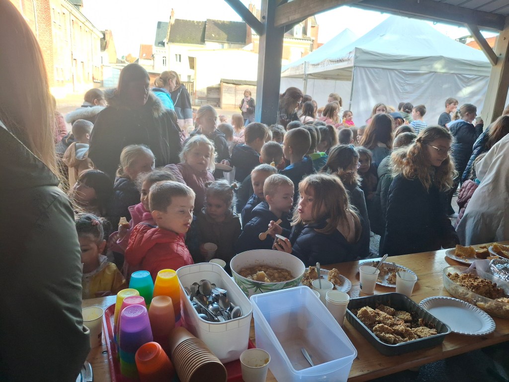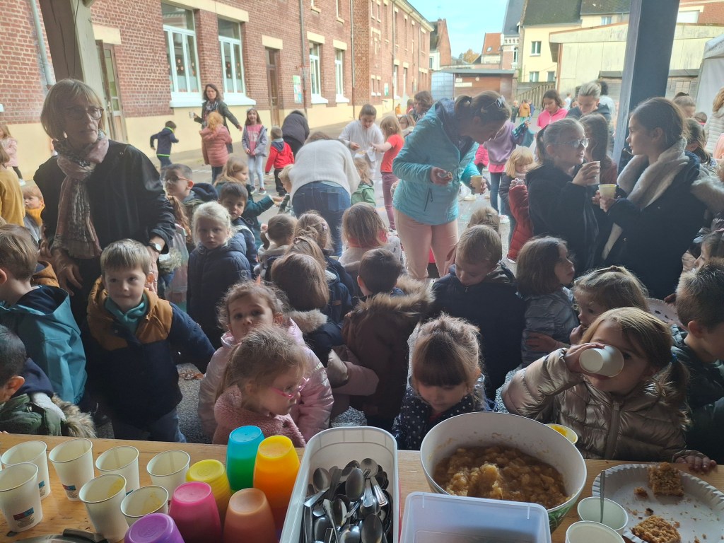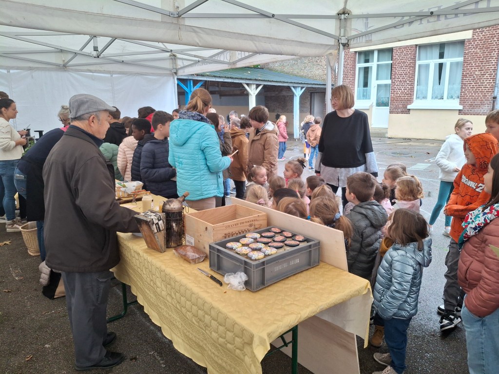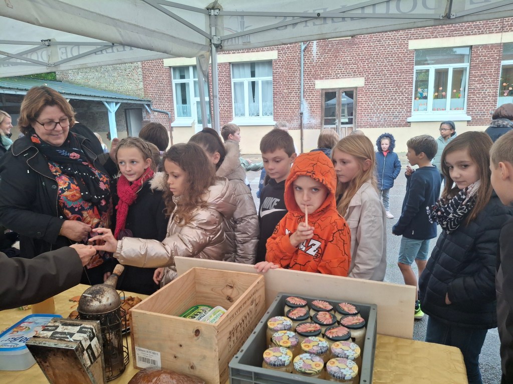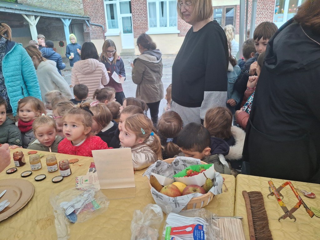 A l’association des parents d’élèves de l’école pour leur participation: nous avons, grâce à eux dégusté de très bonnes confitures provenant d’une productrice d’Autheux « L’Atelier des fruits » ainsi que du miel de Bernaville. Les enfants ont également bu du jus de pommes maison, de la tarte à la rhubarbe confectionné par Emma , maraîcher à Beauquesne « Ô marronnier »,